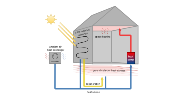 Zur Effizienzsteigerung eines Wärmepumpenheizsystems, werden drei Wärmequellen eingesetzt: Solar-Massivabsorber, Mittelfrist-Erdkollektorwärmespeicher und Außenluftwärmeübertrager. Zusätzlich wird der Wärmespeicher über den Solar-Absorber regeneriert. Die Regelstrategie für den Einsatz der unterschiedlichen Wärmequellen wird optimiert.