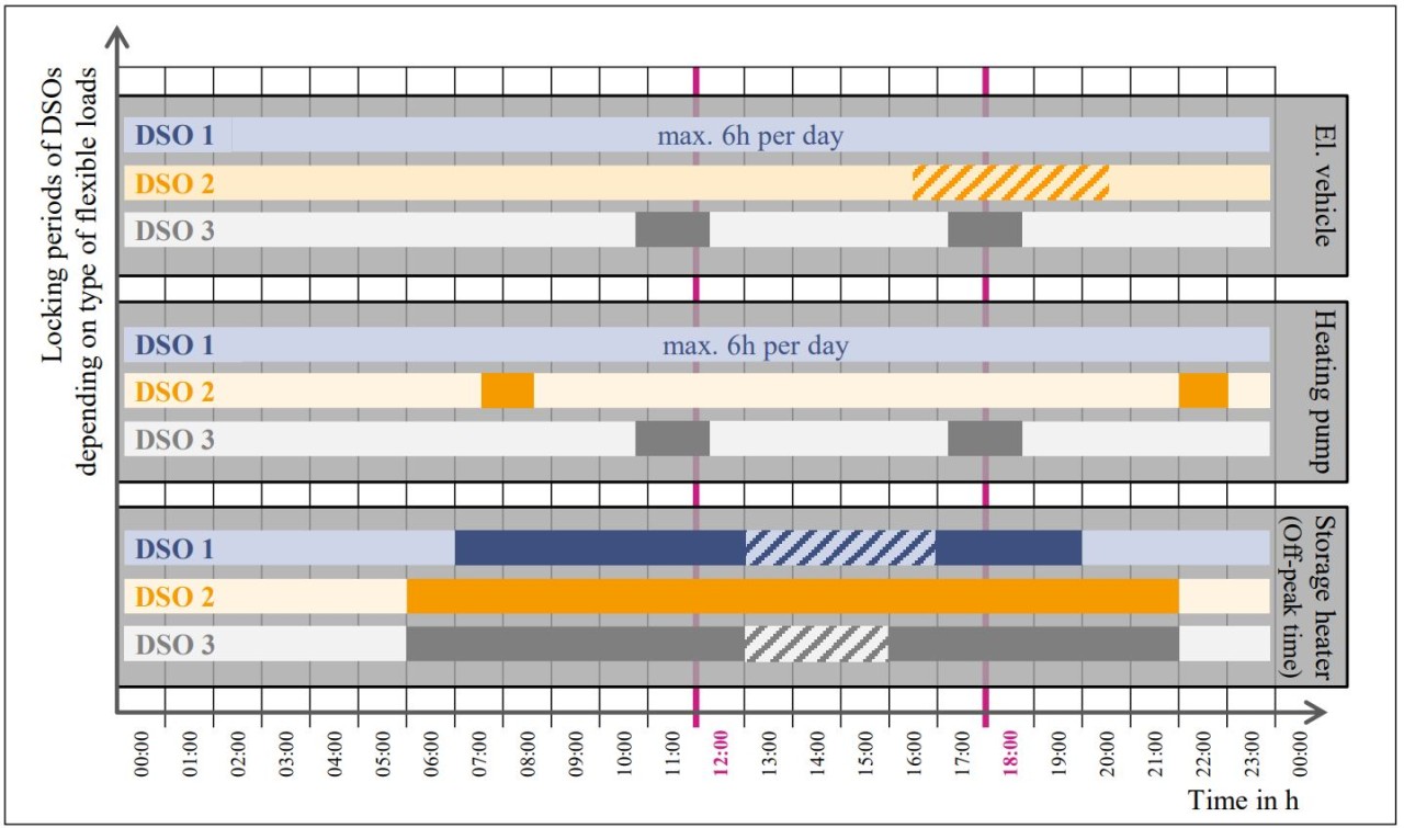 Besides this, consumer privacy concerns and data security have to be considered and are therefore part of the decentralized concept. Furthermore, there are contracts between customers, energy suppliers and DSOs that specify several locking periods for clusters of flexible loads. Depending on the DSO's specifications and the customer contract, an electric vehicle can be blocked for certain time windows, a flexible period during the day or not at all.