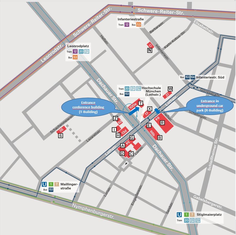 Free parking is available in the underground car park (Lothstr. 64, R-Building, red cube).